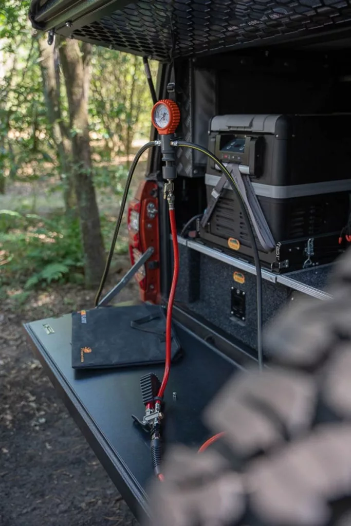 This device attaches to two tires at once, automatically equalizing the pressure and featuring a unique dump valve system. You can connect a compressor to the Indeflate, inflating two tires at the same time, with a built-in pressure gauge to monitor tire pressure.